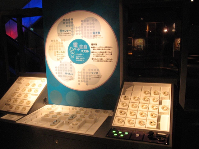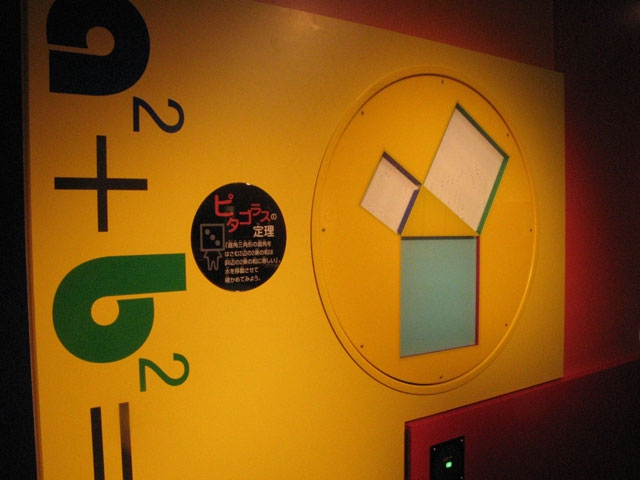 左は8階(ワンダータウン)の数学パズル。高崎市少年科学館にもあったハノイの塔もあります。右は日立シビックセンター科学館でみて感激した水量で表したピタゴラスの定理。