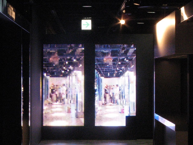 左は9階(テクノタウン)の大型!電子ブロック。右は画素数の違いを感じてもらう大型表示。映っているのは、見学者の我々です。