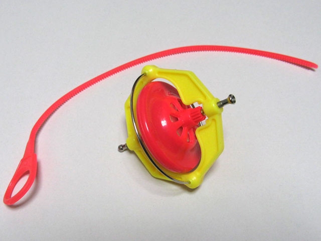 地球コマは糸をコマの芯に巻きつけるのが、なかなか面倒です。これはそこが改良されていて、プラスチックの適度な硬さの棒にギザギザがつけてあって、ギザギザでコマの芯につけた歯車に噛み合って回すようになっています。ラックとピニオンですね。