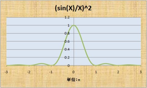 ここでBは2πw/λLでwはスリットの幅、λは光の波長、Lはスリットとスクリーンの距離ですが、グラフでは1としています。