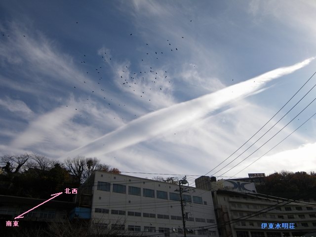 突然カラスが低空で鳴き騒いで急上昇、急降下、旋回を繰り返し数分後に上空に上がって鳴き声も落ち着いた頃の写真ですが、異様な雲はそのあと5分ほどで形を崩して元の空に戻りました。(南東が震源地の方向です)