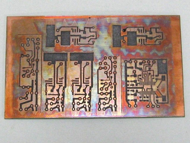 エッチングは100円ショップで売られている冷蔵庫用の冷水筒(1.6リットル)に500ccのエッチング液をいれて、基板を立ててエッチングします。熱帯魚の水槽用の空気ポンプで空気を送り、液を攪拌しています。500ccで適切な液面になるよう、プラスチック材料を沈めています。液温は常温です。夏で40分、冬で60分程度かかります。終り頃引き上げて目視でエッチング状態をみて、終了を決めます。(湯煎などして35~40度にするのがいいのでしょうが、温度管理が面倒なのと、ゆっくりエッチングしたほうが残った紙がとれていいように思っているのですが、よくわかりません)
