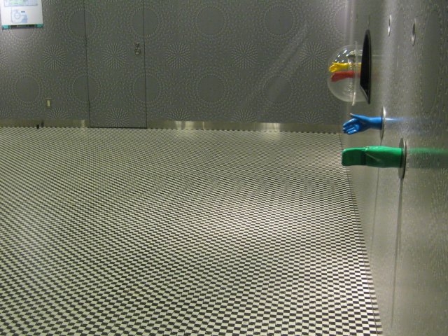 入口です。入ると「握手」があります。5つの手があって握手をするといろいろ挨拶をします。黒い部分は実像が結ばれるようになっているようです。床の模様はこの館の特徴のようで、いろいろなところでこのような模様が描かれています。