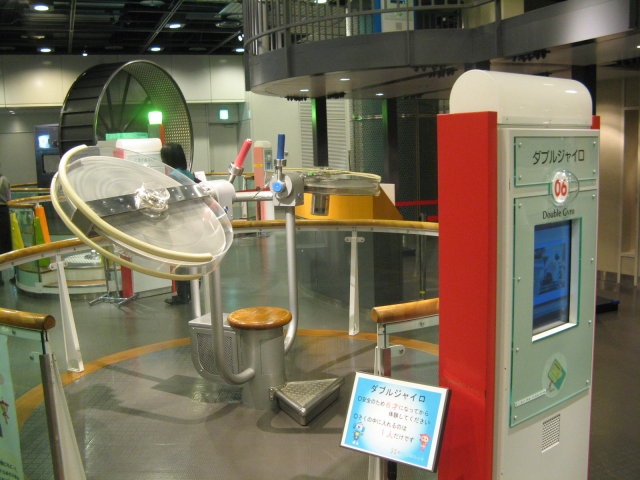 人がコマネズミのように大きな輪の中に入って輪を回すと発電する装置。右は高速で回っている電動のジャイロが2つあってジャイロを動かすと乗っている人が動くというもの。