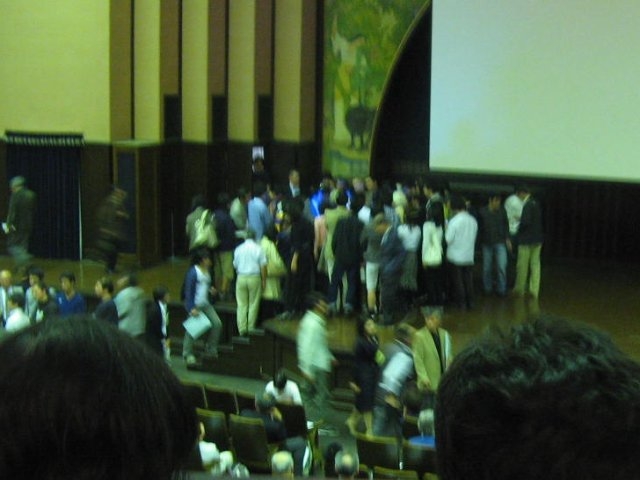 上は休憩時間にGFPのついた大腸菌を見せているところで、檀上に多くの人が登ってみていました。暗いので人がぶれてしまっています。