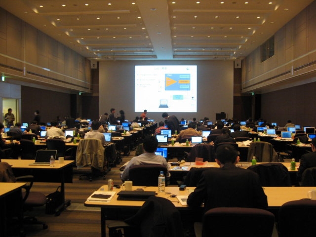 300人ほどが集まっていました。各自ノートパソコンを持ってきていて、アプリケーションデザイナーという開発環境とライターソフトを予めインストールしています。