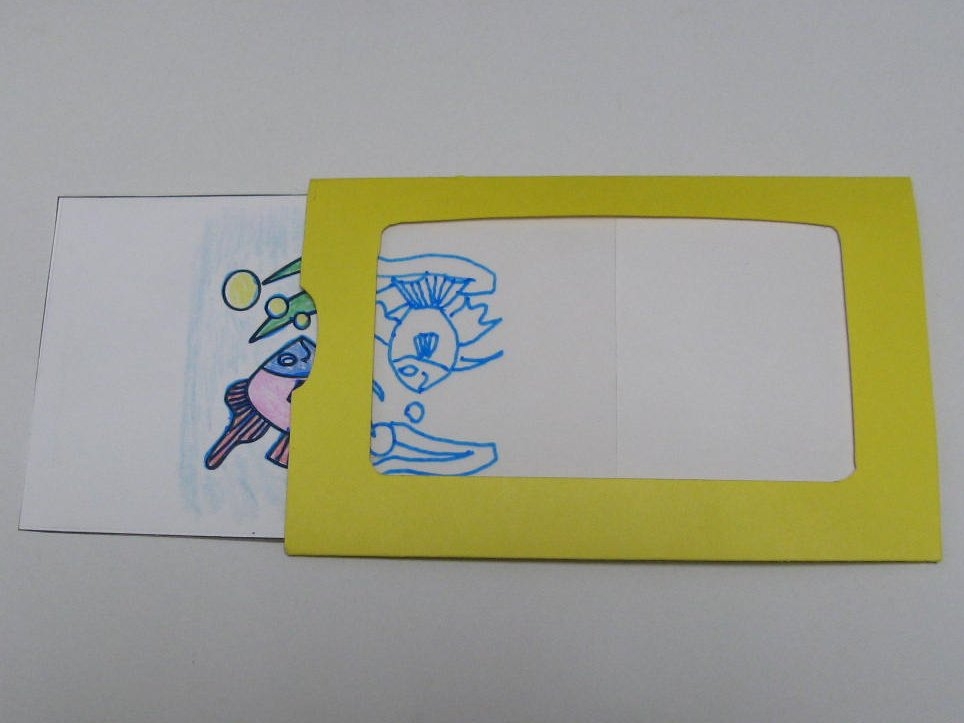 工作は「マジックカード」というもの。ケースから引き出してくると、色が付いていない絵に色が付くというものです。不思議!!面白いので参加して作ってみました。参加料は50円です。