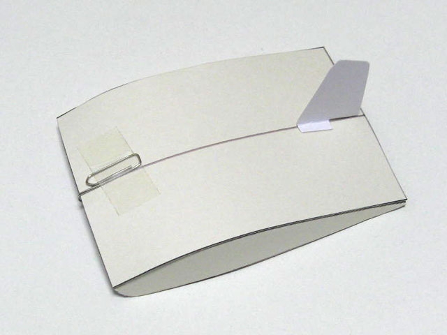 輪ゴムでカタパルトのように引っ掛けて飛ばすと、すーと滑空してかなり飛びます。・・・・・・と言いたいのですが、実はかなり広い場所が必要です。それもフローリングのように表面に凹凸がなくて、平らな場所ですね。畳ではうまく走りません。浮上量がわずかですからね。
