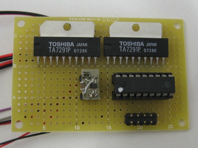 モータコントロールは東芝のTAー7291PというICで定番のICです。このICは平均1A、ピークで2Aの負荷電流を流すことができます。マブチモータの一番安いFA-130は0.5Aですし、トルクの大きいRE-280は0.65Aですので、十分使えます。