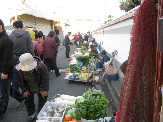 初めてみた朝市ですが、野菜や魚ですね。ご近所の方が買いにみえるのでしょうか。観光客もかなりいたのですが、観光客目当てでない出店がありますね。魚介類と農作物の交換から始まったのでしょうかね。