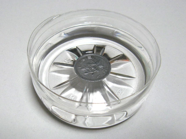 一円玉をそーっと水に浮かべると浮きます。表面張力で重さを支えているわけですね。