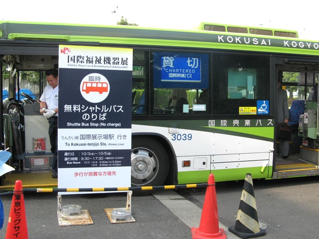 りんかい線の国際展示場駅から無料のシャトルバスが出ていて、それを利用させてもらいました。昇降口に引き出しできる板があって、車椅子やベビーカーでも容易に乗り降りできます。