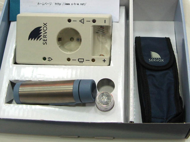さて、面白そうだと思ったものですが、左はドイツ製の「ゼルボックス」という補声器。電気カミソリ程度の大きさで、先端をのどに押し当てて使う咽頭抽出や気管切開をされて、声のでない人のための音声化器具です。