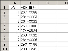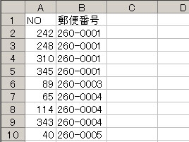 左が元のファイルです。B列に郵便番号が入っています。A列はNOで特に意味はありません。データ件数が何件あるかの目安です。右はB列の郵便番号で並べ替えをしたあとです。次の集計をするために並べ替えをしておきます。