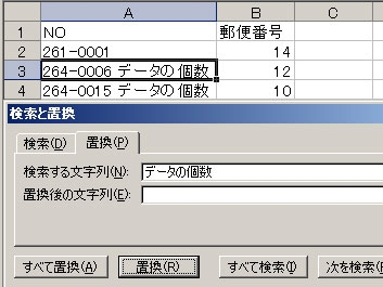 NOの列には郵便番号がはいっているが、集計のときについた「データの個数」という文字がついているので、検索する文字列を「データの個数」置換後の文字列に何も入れずに、置換をします。「データの個数」が消えます。
