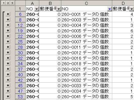 並べ替えのあとB列の郵便番号で集計をします。グループの基準は郵便番号で、集計の方法はデータの個数、集計するフィールドは郵便番号としておきます。そのままでは、次にオートフィルターをかけると集計結果が0になってしまうので、コピーして形式を選択して貼り付けで値のみをC,D列に貼り付けます。オートフィルタをかけ、C列で「データの個数」が入っている行を抽出します。