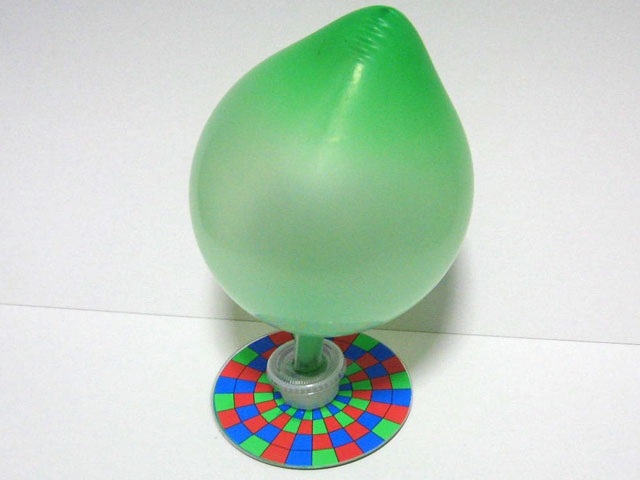 CDの中心穴に、底に小さな穴を開けたフイルムケースを接着して、風船をフイルムケースのふたにつけます。