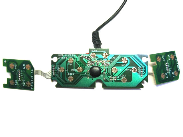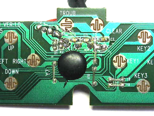 中に入っている基板です。右はその詳細です。基板上に作った導電部分をスイッチにつけた導電性のカーボン?でショートすることにより、スイッチのオン・オフをしています。いまはキーボードもみんなこの方式ですね。安くつくれるからでしょうね。