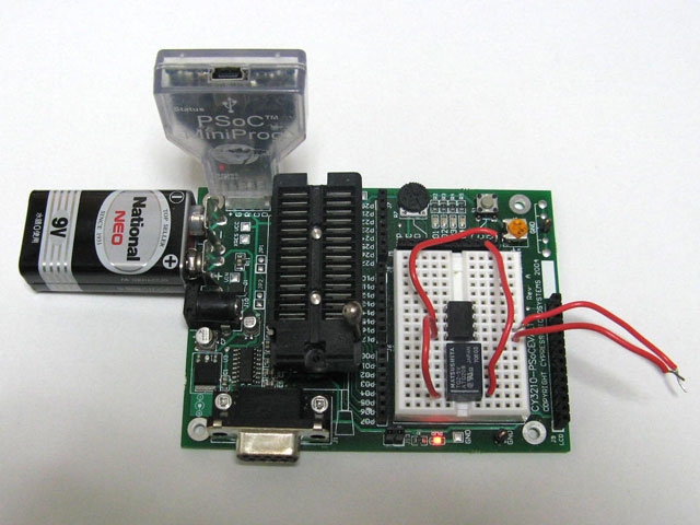 リレーとフォトカプラーをブレッドボード上で動作させます。ブレッドボードは殆ど使わないのですが、これはPSoCのエバリュエータ基板に付いているごくごく小型のものです。フォトカプラーの出力トランジスタでリレーを駆動します。電源電圧は5ボルトです。フォトカプラーの入力LEDに実験用可変電源で電圧を変えて何ボルトでリレーがオンするか確認します。1.3ボルトでオンするようです。